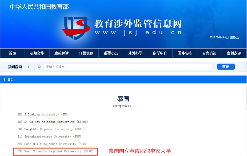 泰國國立宣素那他皇家大學(SSRU)是全泰國名列第一的皇家大學,始建于1937年。學校設有14個學院以及附屬小學和附屬中學。大學有五大校區(qū),主校區(qū)坐落于首都曼谷中心的宣素那他皇家園林,另外四個校區(qū)分別是佛統(tǒng)校區(qū)、拉廊校區(qū)、夜功校區(qū)和烏汶校區(qū)。大學現(xiàn)有全日制本、碩、博在校生30000余名。