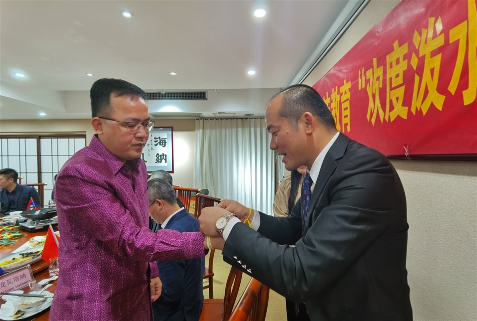 (老撾駐南寧總領(lǐng)事館總領(lǐng)事維拉薩宋蓬先生為致公黨廣西區(qū)委秘書(shū)長(zhǎng)兼辦公室主任李永政先生栓線禮節(jié))