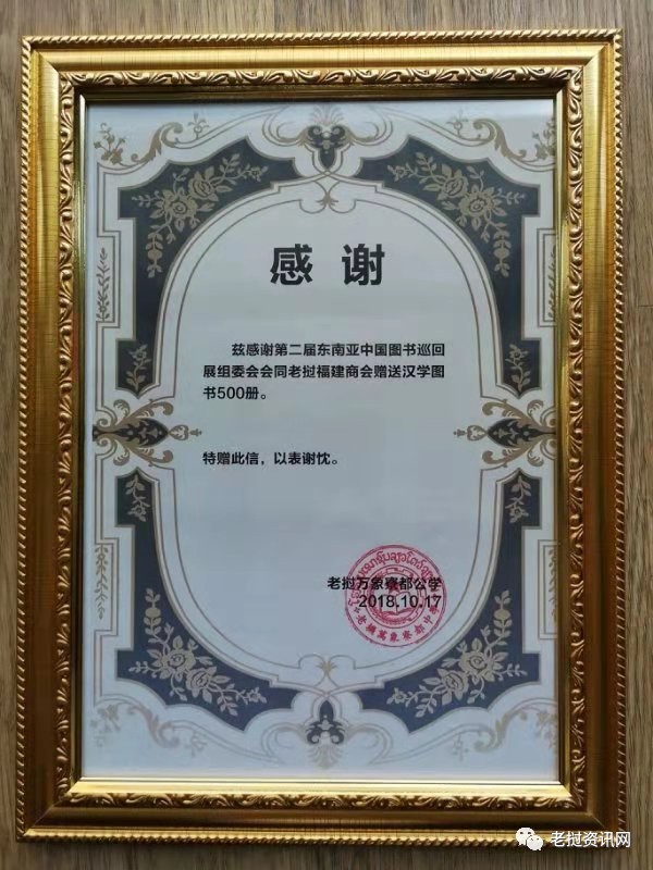 贈(zèng)書活動(dòng)儀式安排在學(xué)校會(huì)議室舉行,寮都公學(xué)董事長林俊雄從老撾福建商會(huì)代表們手中接過由第二屆東南亞中國圖書巡回展組及老撾福建商會(huì)共同向竂都公學(xué)捐贈(zèng)的價(jià)值近3萬元的圖書。據(jù)介紹,本次捐贈(zèng)圖書內(nèi)容涵蓋中國傳統(tǒng)文化、經(jīng)典文學(xué)、漢語學(xué)習(xí)為主等各類圖書500冊(cè)。交接儀式結(jié)束完畢后,林俊雄董事長當(dāng)場(chǎng)向老撾福建商會(huì)代表頒發(fā)了受贈(zèng)感謝狀。