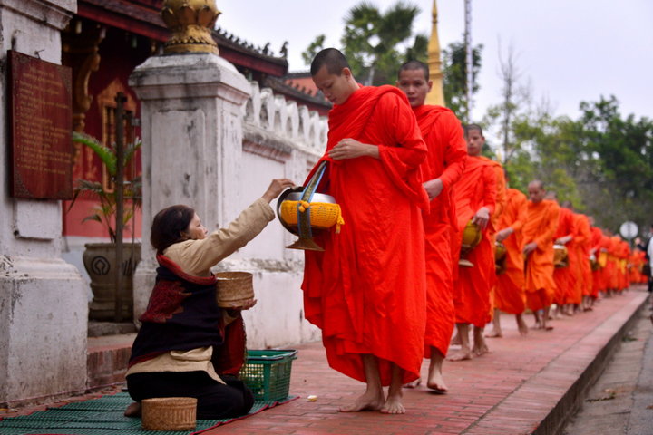 在老撾的許多地方,布施是一道獨特的風景。每天拂曉,僧人們會離開寺院,身披橙色袈裟,結隊到街道上或村莊里化齋。虔誠的佛教徒跪在道路的一邊,雙掌合十,接受僧侶誦經祝福。誦經完畢,僧侶們排著隊伍依次從人們的面前赤腳行過,人們把米飯、餅干、水果、雞肉等食物放進僧人們的竹編小籃中。這些食品,就是僧人們一天的口糧。