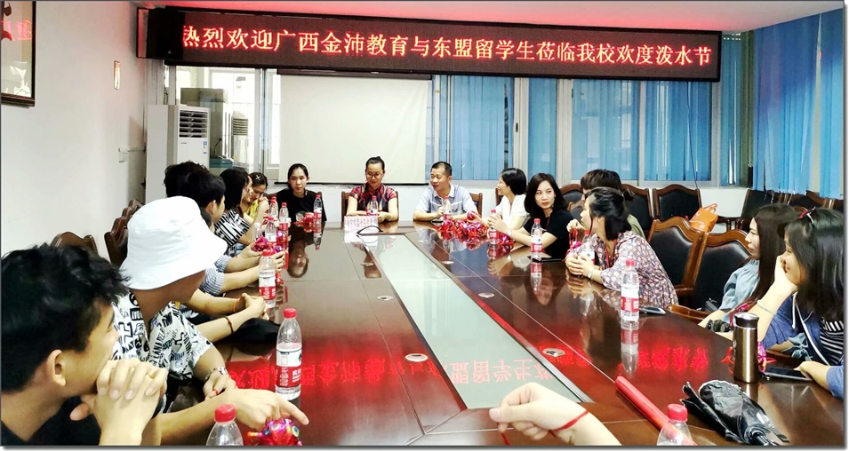 南寧市第十五中學(xué)盧副校長及譚主任親自到校門迎接并在會(huì)議室熱情接待了大家。在歡迎會(huì)上,盧副校長向東盟各國留學(xué)生介紹了學(xué)校概況并送上壯族特色的繡球表示歡迎。南寧市第十五中學(xué)是東盟文化相融合的特色高中,至此高考來臨之際,為增進(jìn)師生互動(dòng),緩解高三學(xué)子的考試壓力,學(xué)校以東盟特色的潑水方式傳遞祝福、共同祈愿,同時(shí)也為中國學(xué)生與留學(xué)生提供了一個(gè)文化交流平臺(tái)。