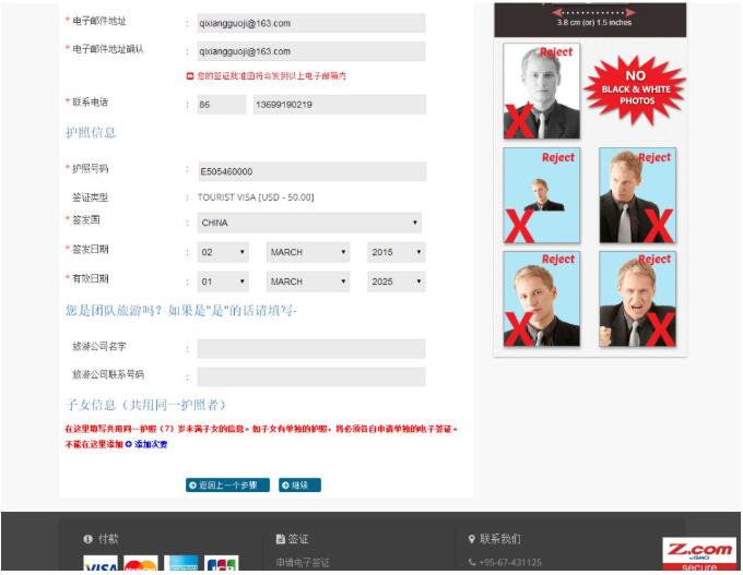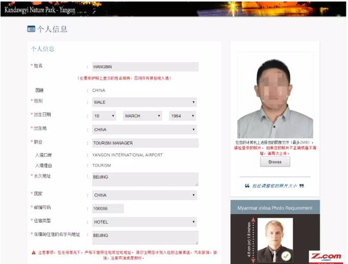 這是頁面的上半部分;比較簡單;名字;國籍;性別,出生日期;出生地,職業(yè),這些都按照護照的信息填寫;常駐家庭地址;國家;郵編;在緬甸的入住酒店的類型;酒店,公寓,快捷酒店;之類的選擇;酒店的名稱;還沒有預(yù)定的話,就可以上網(wǎng)預(yù)定一個可以取消的那種;很多網(wǎng)站都可以在一定時間內(nèi)取消酒店;預(yù)定一個,這些酒店信息就都有了;注意,照片不能大于2M哦;