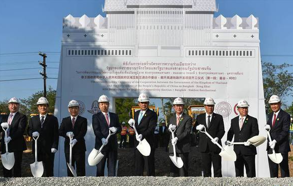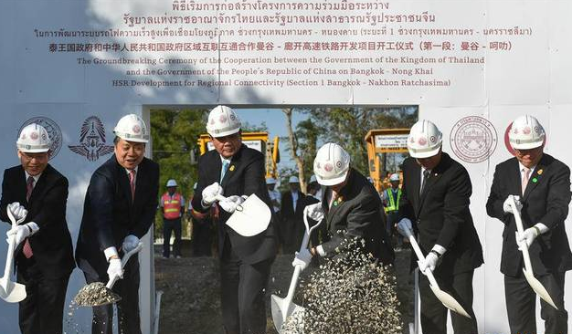 12月21日,泰國總理巴育(左三)與中泰鐵路合作聯(lián)委會中方主席、國家發(fā)改委副主任王曉濤(左二)等嘉賓們在泰國東北部呵叻府巴沖縣舉行的中泰鐵路合作項目一期工程開工儀式上共同鏟土。當日,中泰鐵路合作項目一期工程開工儀式在呵叻府巴沖縣舉行。李克強總理向開工儀式發(fā)來賀信。泰國總理巴育親臨現(xiàn)場致辭。中泰鐵路合作聯(lián)委會中方主席、國家發(fā)改委副主任王曉濤、中國駐泰國大使呂健,泰國交通部長阿空、內(nèi)政部長阿努蓬,以及來自中泰政府部門、鐵路管理部門、相關(guān)企業(yè)、媒體等近400人出席開工儀式。新華社記者李芒茫攝