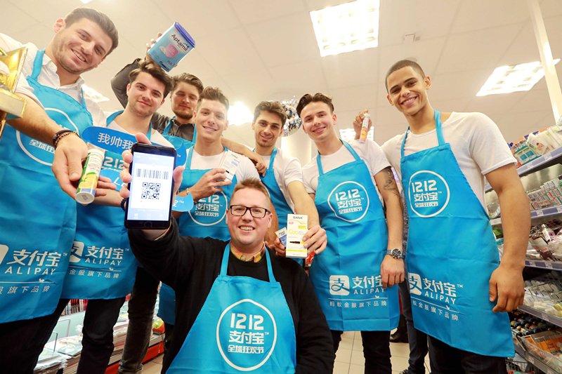 當(dāng)?shù)貢r(shí)間12月11日,德國(guó)“網(wǎng)紅”阿福(前排中)在法蘭克福市中心一家Rossmann日化連鎖為“雙12”促銷活動(dòng)助陣。受到中國(guó)國(guó)內(nèi)民眾歡迎的“雙12”購(gòu)物狂歡今年由支付寶引入德國(guó)。