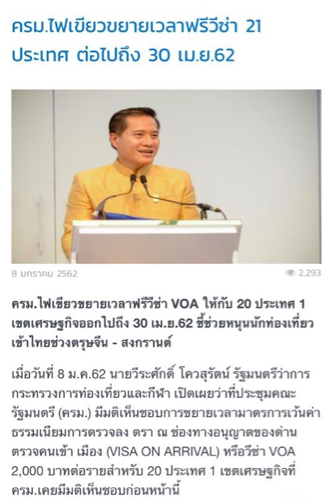 新京報訊(記者 王勝男)據(jù)泰國媒體《曼谷商業(yè)新聞》、《曼谷郵報》等報道,1月8日,泰國旅游與體育部長威拉薩在內(nèi)閣會議結(jié)束后宣布,為刺激泰國旅游,泰國內(nèi)閣通過了將免除泰國落地簽證費政策延長3個月至2019年4月30日的提案,并表示落地簽免費政策的延長將促使春節(jié)和泰國潑水節(jié)期間的來泰旅客人數(shù)增加。目前此項法案還需經(jīng)泰國王室公報公告才能生效。