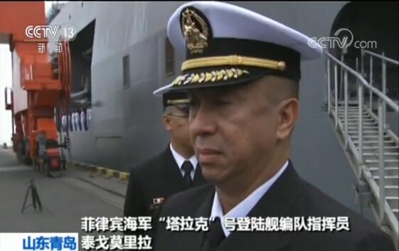 菲律賓海軍塔拉克號登陸艦編隊指揮員 泰戈莫里拉:是的。首先,我想代表菲律賓政府、菲律賓軍隊、菲律賓海軍,以及我們的海軍司令羅伯特·埃姆佩德拉德將軍,表達對于邀請我艦參加中國人民海軍成立70周年慶典的感謝。我艦的到來代表著菲海軍與中國海軍締結更加密切關系,以及與各國海軍加強友誼與合作關系的強烈意愿,除了參加國際海上閱兵式之外,我艦還將參與一些建立互信機制的活動,我們會邀請貴方的海軍及政府領導人參加。我艦還將舉辦文化交流活動,包括技術交流和開放日活動等,所有這些活動的目的都是為了加強各國海軍之間的友誼以及促進國際和平與各方合作,我們很期待接下來的這五天。