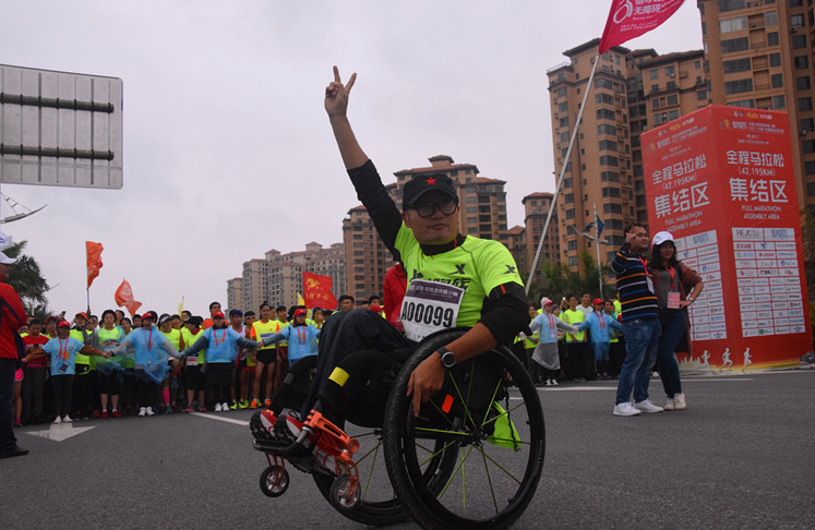 在眾多的選手中,坐在輪椅上的張先生顯得尤為搶眼。張先生來自廣州,他告訴記者,這是他參加的第54場馬拉松比賽,也是第一次參加全海景跑道的馬拉松, “我參加比賽不是為了出成績或出風(fēng)頭,而是重在參與,是想體現(xiàn)一種精神。”張先生說,他不一定能全部“跑”完全程,但他一定會堅(jiān)持到最后。